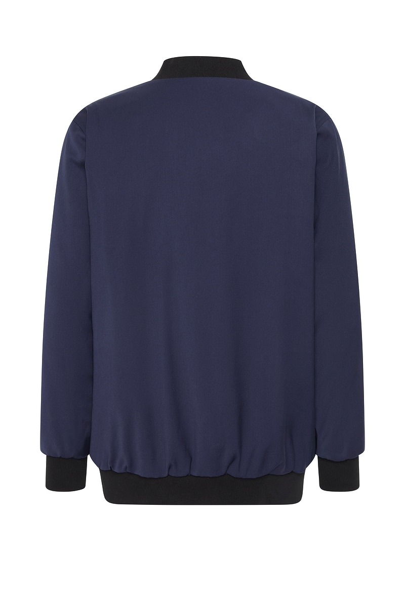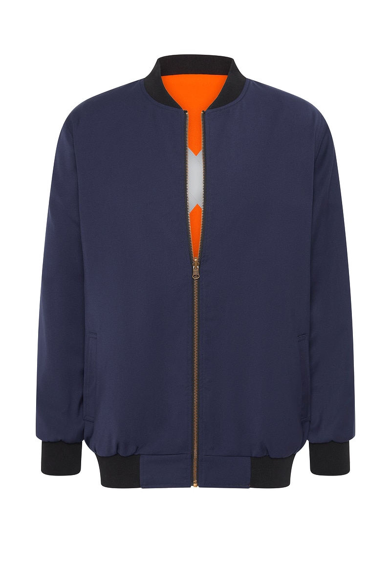 Elevate your workwear game with this sleek navy bomber jacket—designed for professionals who demand performance, polish, and presence. With a clean silhouette and vibrant orange lining, it’s the perfect fusion of understated style and standout detail.
